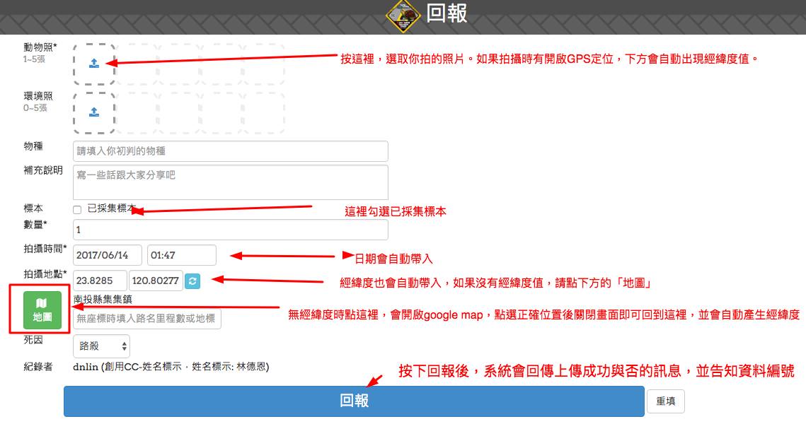 於路殺社官網上傳紀錄:點選線上回報,依裡面的說明選擇欲上傳照片,程式會自動填寫拍照日期和座標資訊後,請協助確認資料正確後,按最下方的「回報」即可。