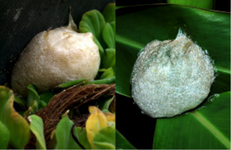 斑腿樹蛙在靜水域旁的植物體上或草叢根部產黃褐色泡沫卵塊,八里有發現藍灰色。楊懿如提供