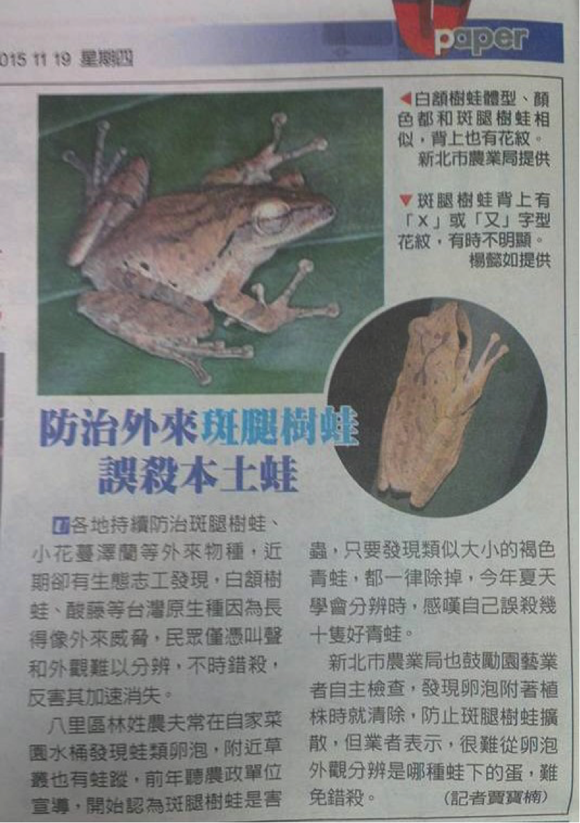 日前有媒體報導「為了防治外來種斑腿樹蛙而誤殺本土蛙」。對此,國立東華大學自然資源與環境學系副教授楊懿如表示報導失真,有誤導之虞,形同扼殺本土原生種保育研究團隊的心血,讓人痛心。