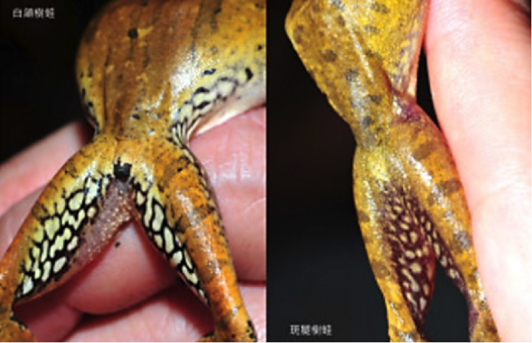 左為布氏樹蛙,大腿內側細網花紋;右為斑腿樹蛙,大腿內側網紋花紋很粗像黑底白點。楊懿如提供