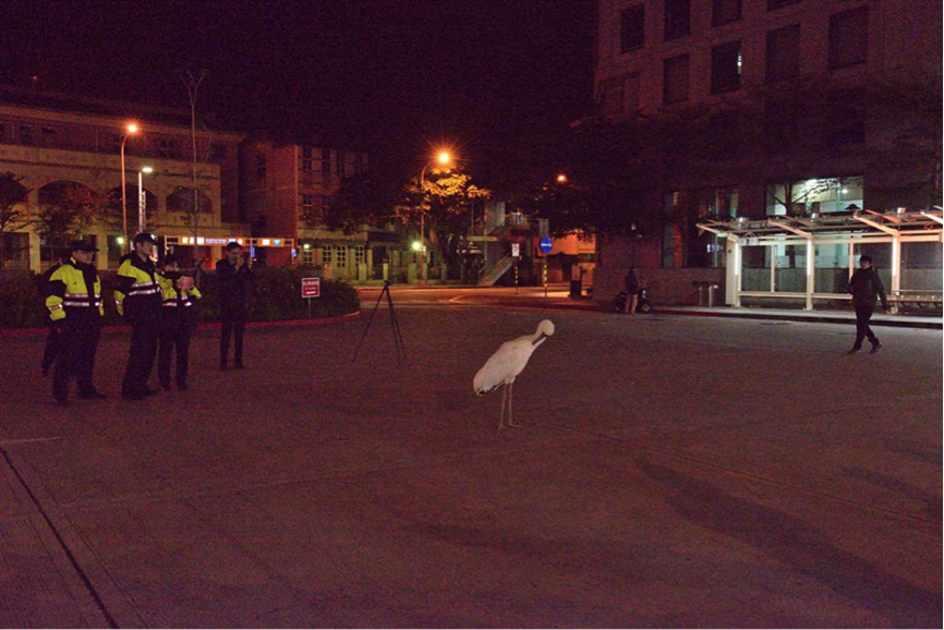 佇足在八德路四段上的小鶴,似乎很疲倦,站在原地頭藏在身體就睡著了,讓相關人員一度猜測是由西伯利亞過境迷路的另一隻個體。 圖游崇瑋提供。
