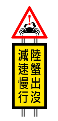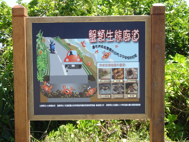 綠島有多種陸蟹及陸生寄居蟹生存其間,然而每年高達40萬人次的遊客量,卻早已趕過其生態承載量。夏天的綠島已成為多種野生動物難以承受的痛…島山目前於燈塔及人權園區附近設有多個蟹類地下廊道,唯成效不佳!環島公路上的路殺熱點設有10面警示牌,但成效同樣不佳。機場旁「小心飛機」警示牌應該是國內唯一的一面。