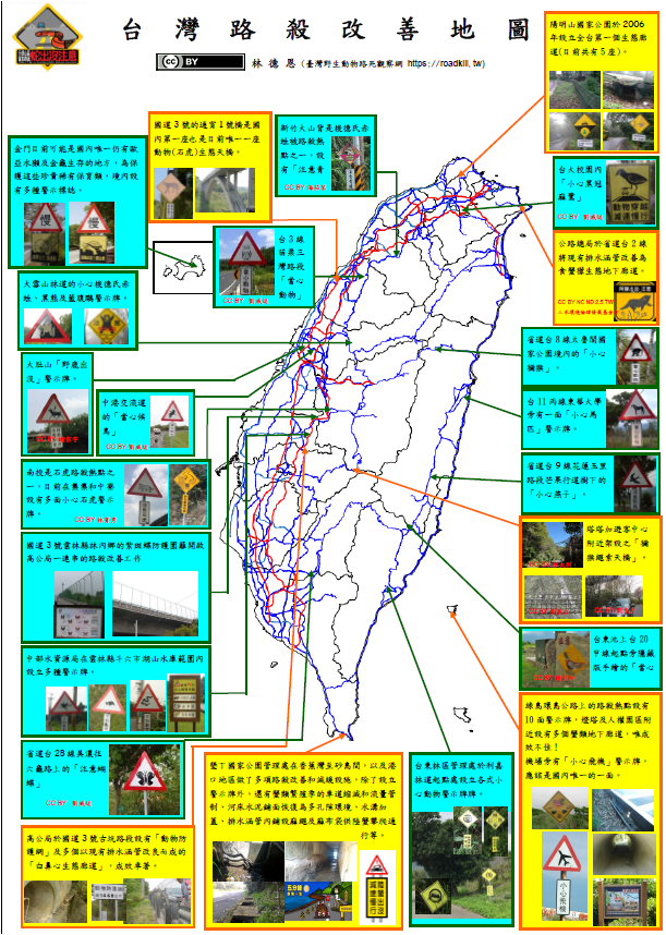 礙於版面緣故,路殺改善地圖解析度無法達到需求,若您需要高解析度的檔案,請點選連結下載 台灣路殺改善地圖使用(使用時標註「CC BY 3.0 TW 林德恩作」以及引用網址https://roadkill.tw 即可)。