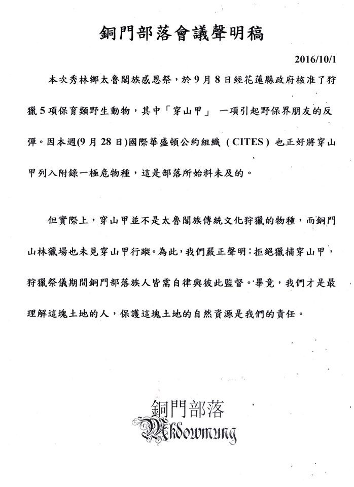 銅門部落也發布聲明稿表示:「穿山甲並不是太魯閣族傳統文化狩獵物種,而銅門山林獵場也未見穿山甲行蹤;因此,拒絕獵捕穿山甲,狩獵祭儀期間銅門部落族人皆需自律與彼此監督。畢竟,我們才是最理解這塊土地的人,保護這塊土地的自然資源是我們的責任...」。銅門部落聲明稿全文