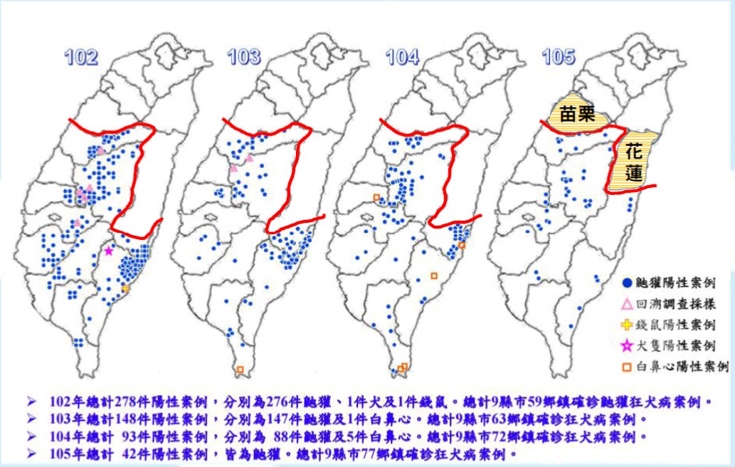 狂犬病存在台灣已至少超過210年,且成為在地化的病毒株,從沒有消失過,未來要讓其完全消失的可能性也非常低;狂犬病防治更是全球公共衛生重要議題,農委會特有生物研究中心路殺社統計,每年4月及10、11月是鼬獾路死高峰期,根據這幾年的追蹤,若只統計疫區的路死鼬獾篩檢結果,則有44.4%都感染了狂犬病(送驗117隻中有52隻為陽性反應)。