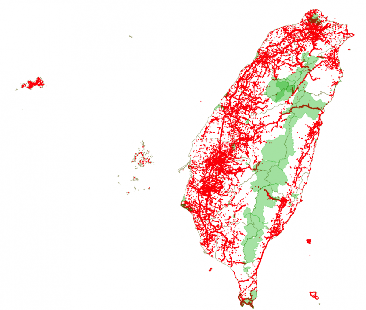 在地圖畫上套入路殺社6年多來記錄的54,000多個點位,再加上國家公園和高速公路匯入的47,000多個動物死亡點位,根本是血蕃薯了................. 佈滿血絲的台灣。