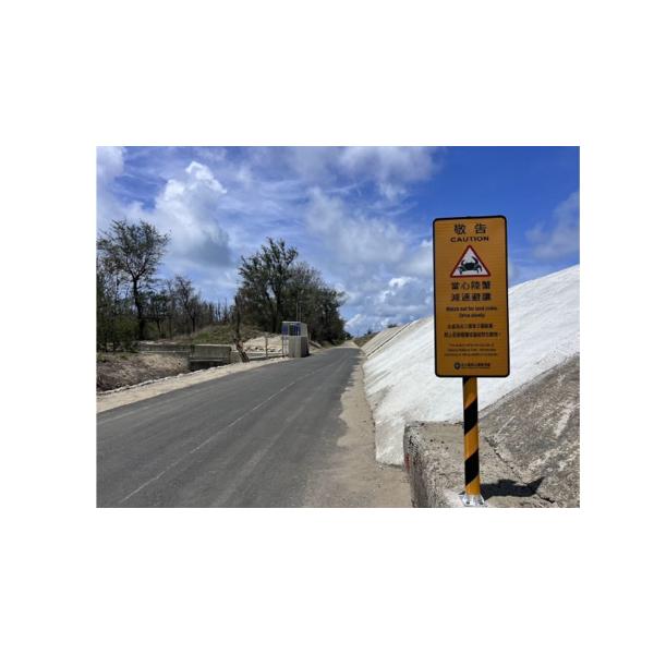路殺友善設施 紀錄時間2024-11-05 17:14地點23.04535,120.06953 台南市安南區 紀錄者 林德恩 道路類型 防汛道路 設施類型 警示牌 補充說明 台江國家公園於曾文溪出海口旁台南市青草崙海堤設立小心陸蟹警示牌,保護降海釋幼的兇狠圓軸蟹 記錄編號512142