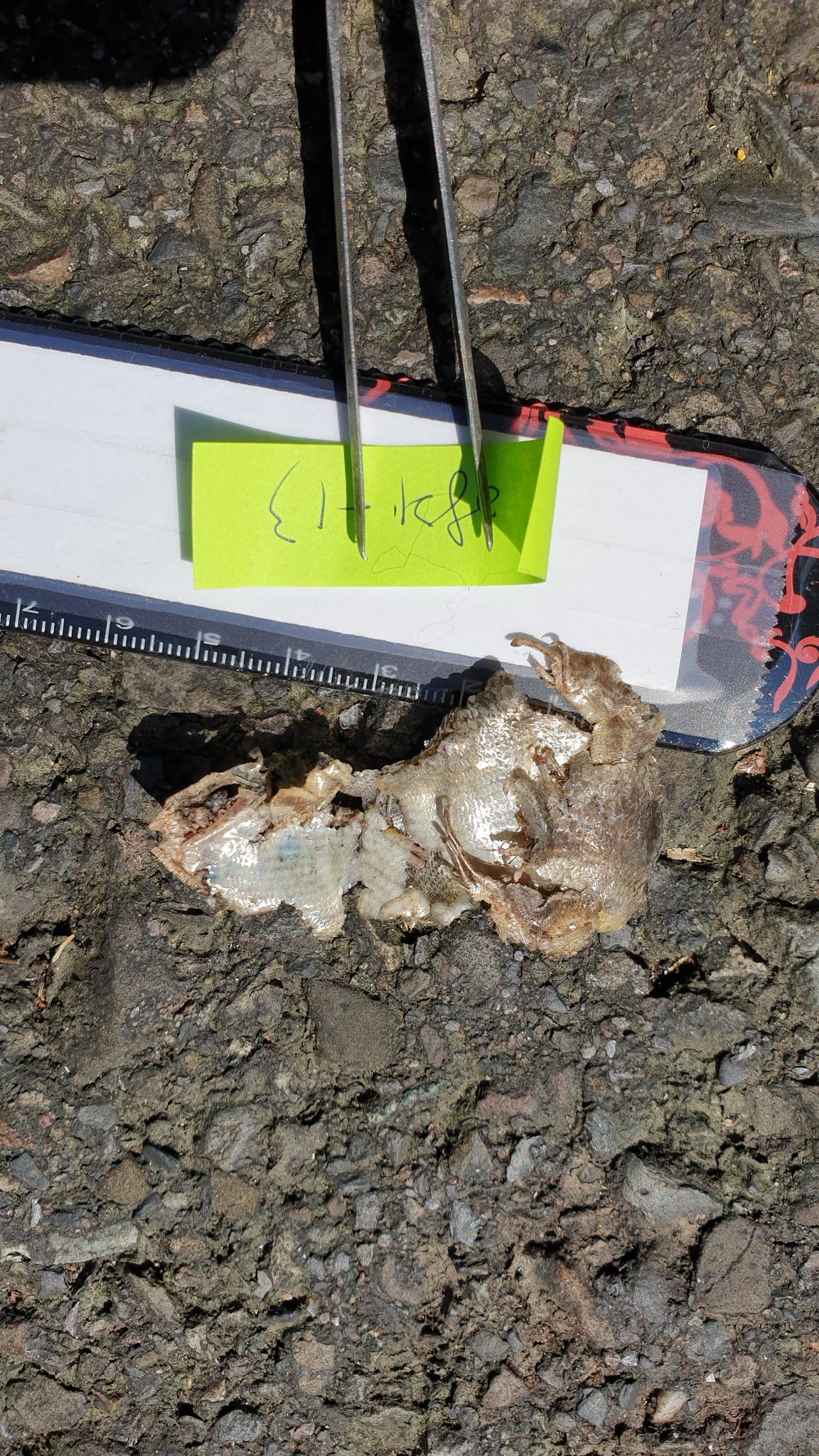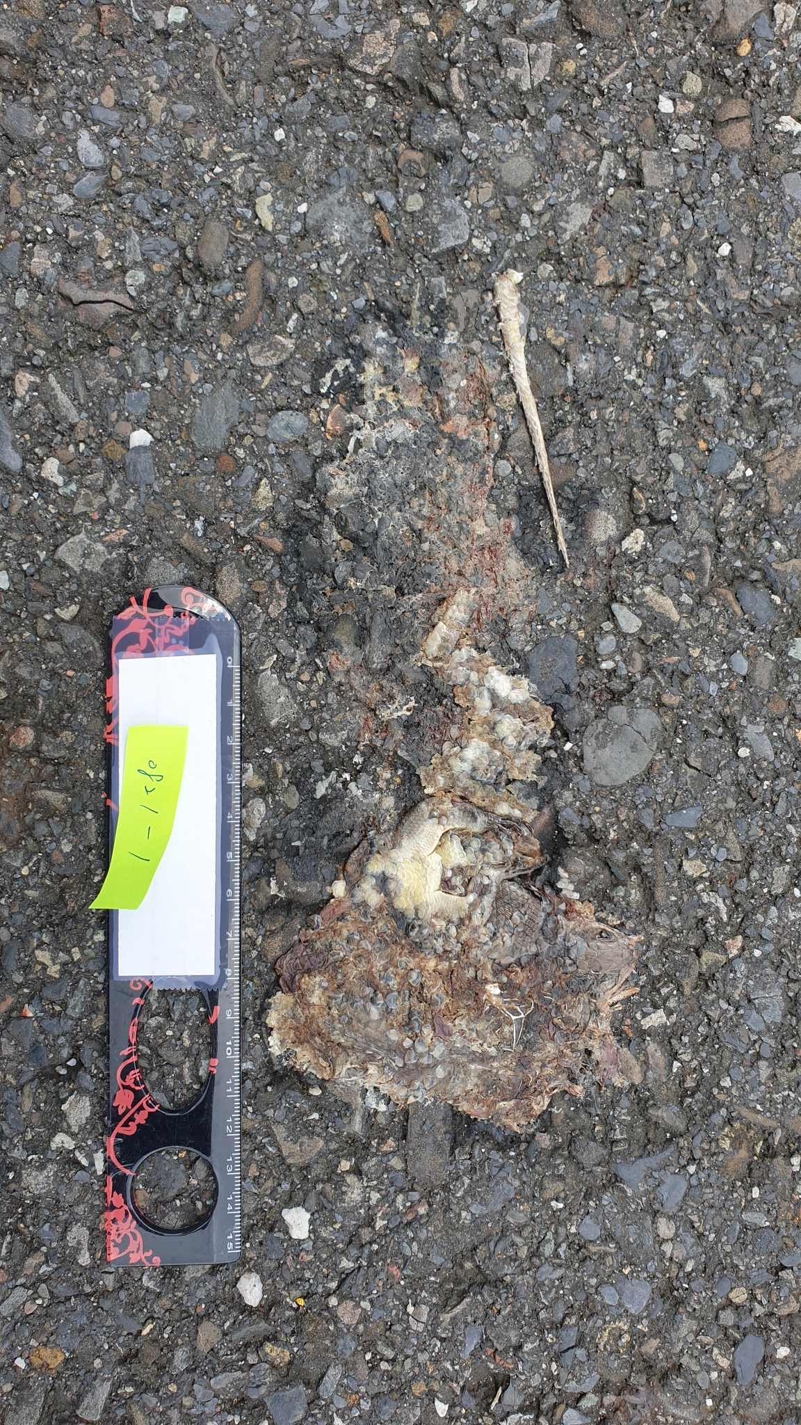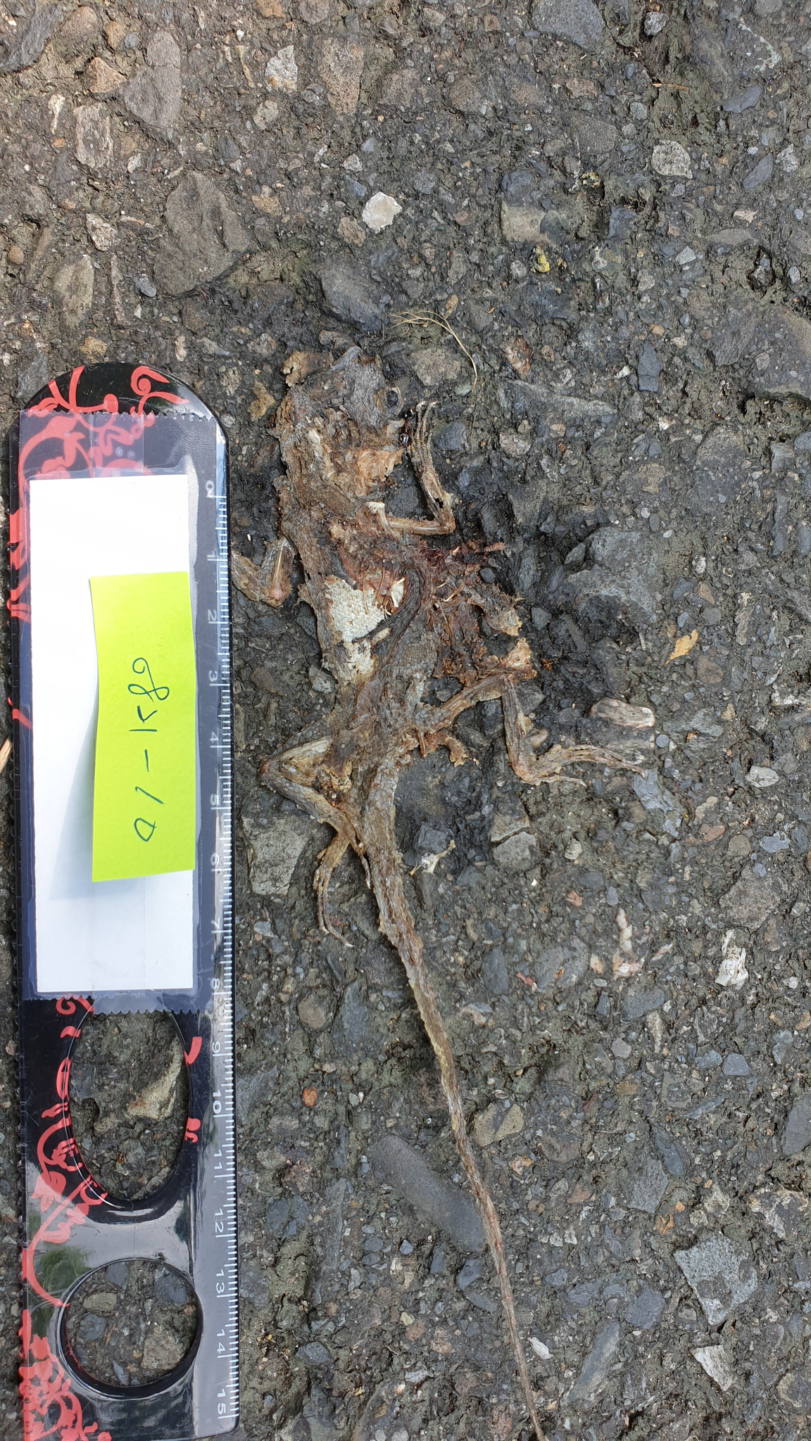 身體已不再現場,僅剩下尾巴及部分表皮,依尾巴型態判斷為斯文豪攀蜥
