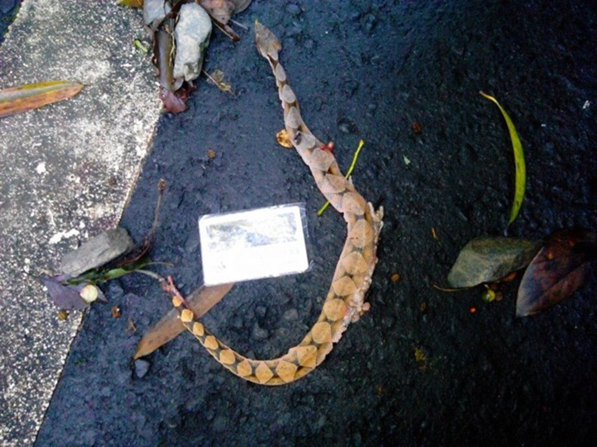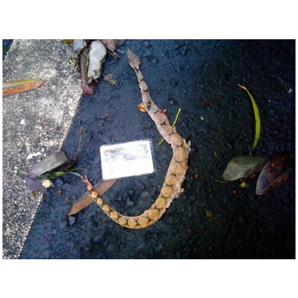 特徵說明: 吻端上翹,頭部明顯呈三角形。身體主要為黃褐色,體側有許多三角形的黑色斑紋;腹部為白底有黑色塊狀斑紋