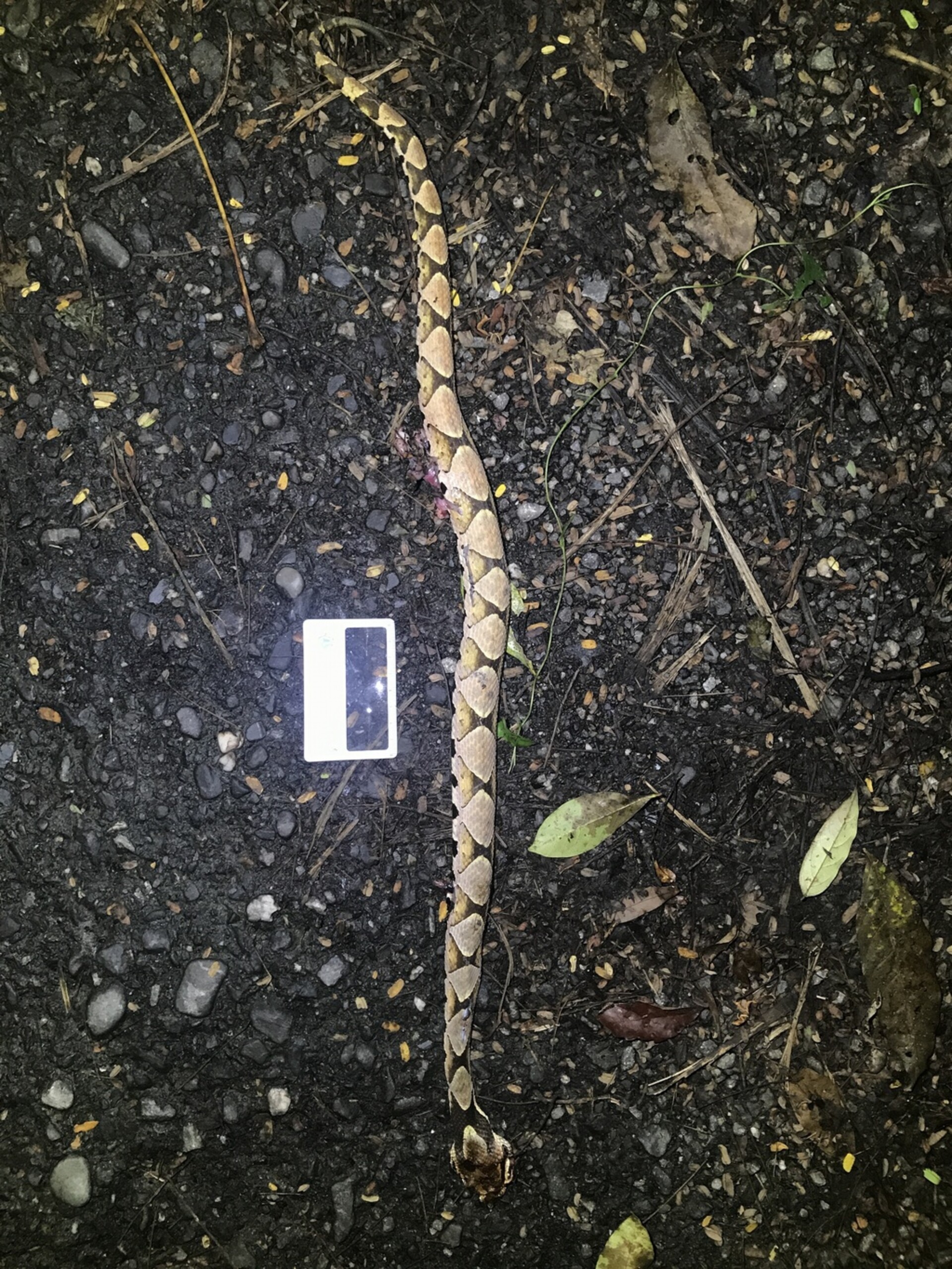 物種百步蛇 Deinagkistrodon acutus[原始紀錄物種] --鑑定 ● 鑑定時間未知敏感層級輕度紀錄時間2018-10-16 20:23地點22.28,120.86 台東縣達仁鄉記錄者林佳宏1數量1 死因 路殺 類群 標本已採集標本 補充說明 鑑定題庫爬蟲類: 考試級 I、考試級 II 特徵說明: 吻端上翹,頭部明顯呈三角形。身體主要為黃褐色,體側有許多三角形的黑色斑紋;腹部為白底有黑色塊狀斑紋 授權照片授權: CC BY (林佳宏1)識別號01dd9379-c1e0-4699-81b7-7db153c3e6bb (OccurrenceUUID)156939 (nid)