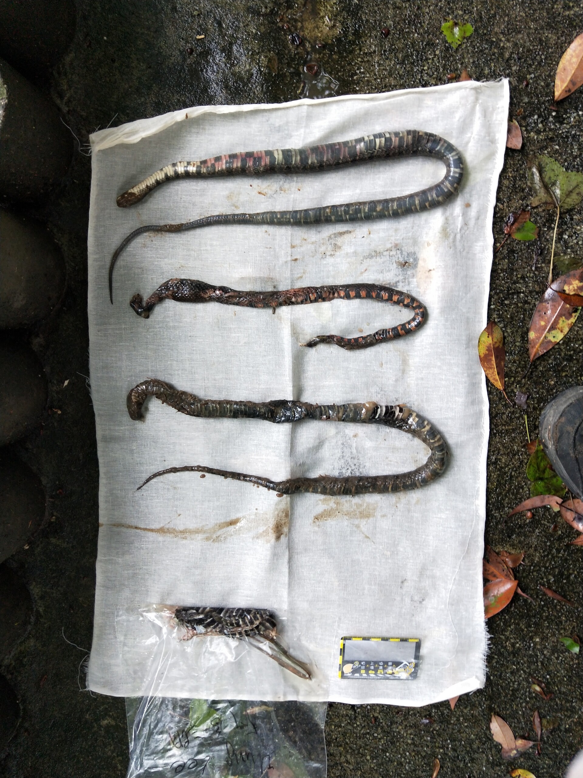 特徵說明: 體型圓胖的中型蛇類,體背深褐色,體側具黑色環紋,腹部為赤紅、白與黑色交錯橫斑。有些個體上下頷的黑色縱紋明顯。