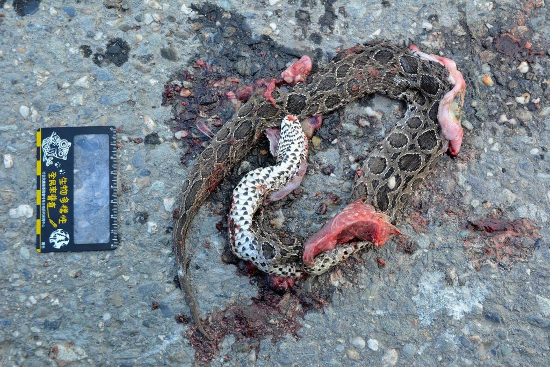 特徵說明: 頭部有3個呈三角形排列的深色斑、體型粗壯、背部中央及體側具3條縱行排列之深咖啡色圓型斑。背部大型圓斑外圍有明顯淺色紋包圍。腹部鱗片為白色底雜有許多略帶三角形的深色斑。