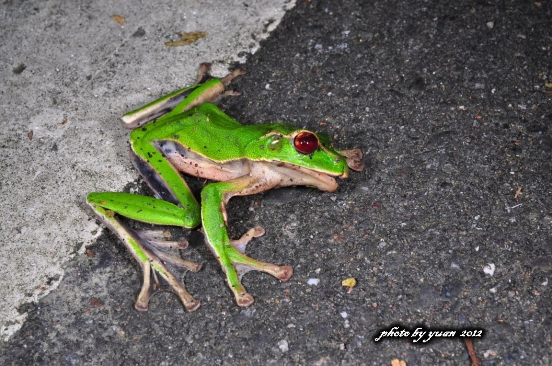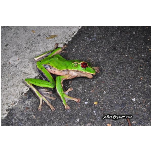特徵說明: 背部綠色,腹部潔白。背腹相接處有一條不太明顯的白色條紋,腹部、腹側及大腿內側常有大型的黑斑,眼睛有一條黃褐色過眼線。分布於臺灣新北、宜蘭、桃園。