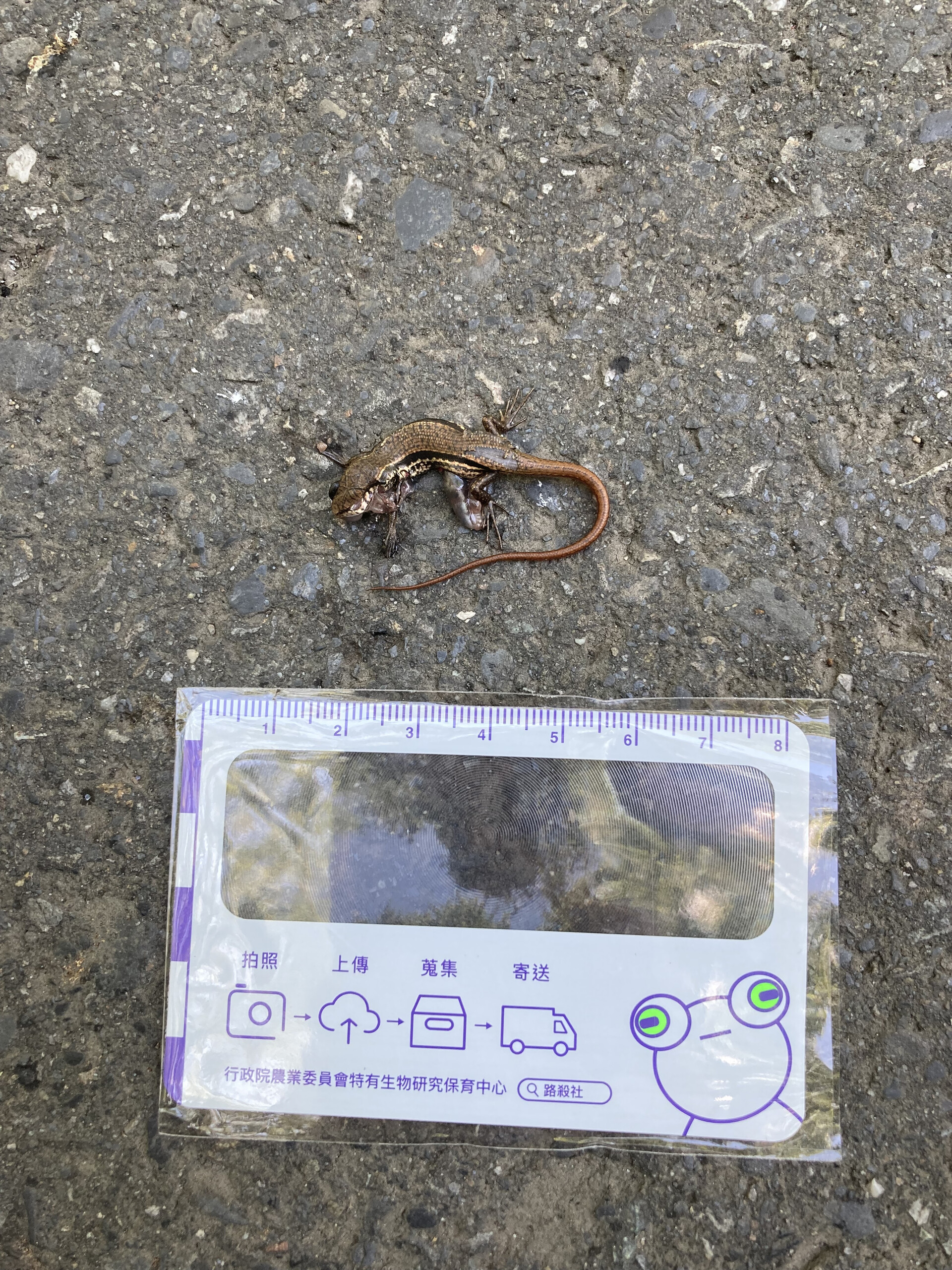 | 2025-04-17 | 挑戰成功 | 吳昭頤 | 股鱗蜓蜥 Sphenomorphus incognitus 體背主要為褐色,背後有許多的黑色雜斑分布,體側由吻端經過眼而延伸至尾之基部有一黑色寬縱帶、縱帶上常有白色斑點。鱗片光滑緊密,幼蜥尾巴橘紅。體側顏色較褐色調漸層,大腿股部鱗片不規則排列,腹部為白色。 |