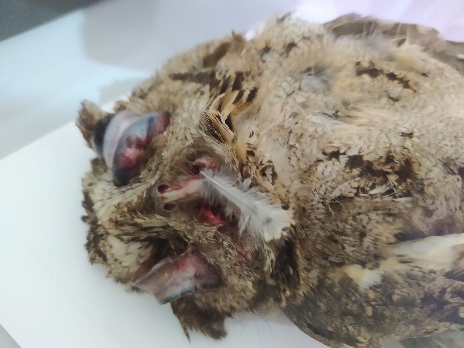 眼球有點爆,口有血,雙翼和腳沒有明顯外傷