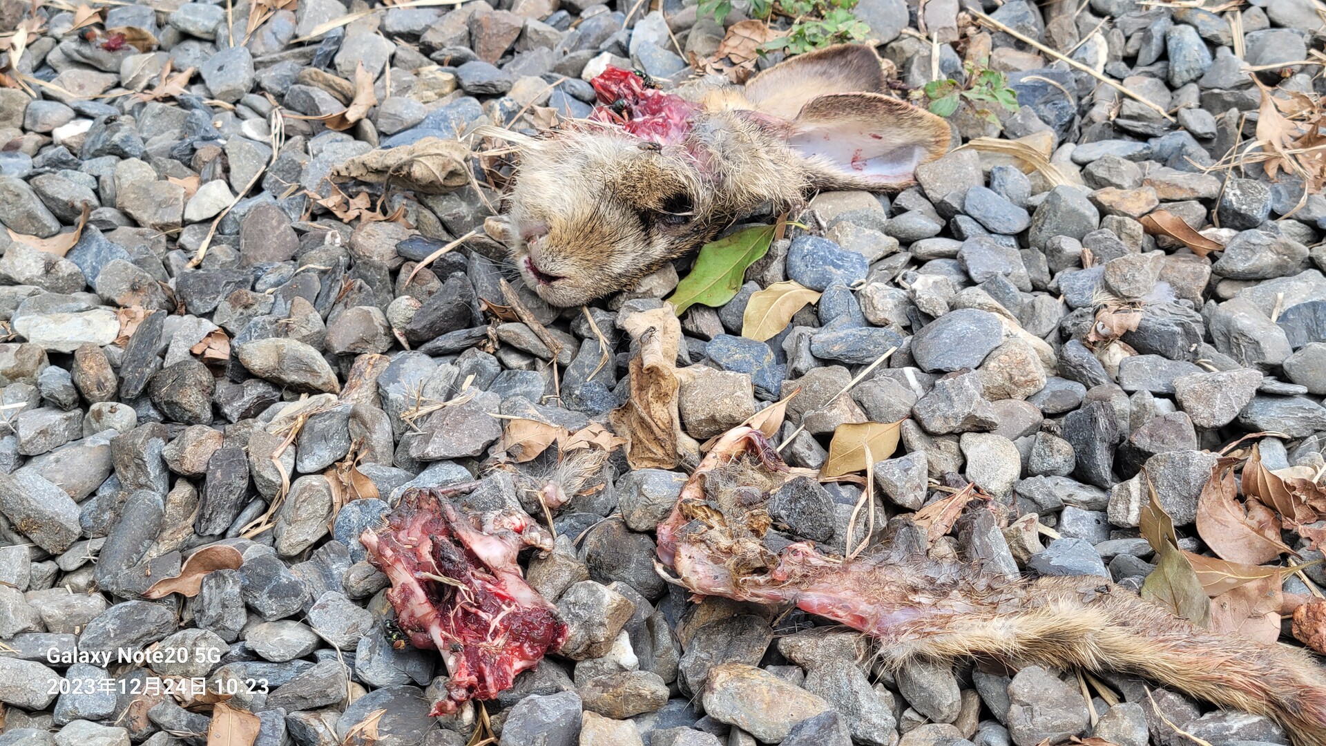 判斷為流浪狗群捕殺,因為往前一段路有看到一群流浪狗在喫另外一部分的身體