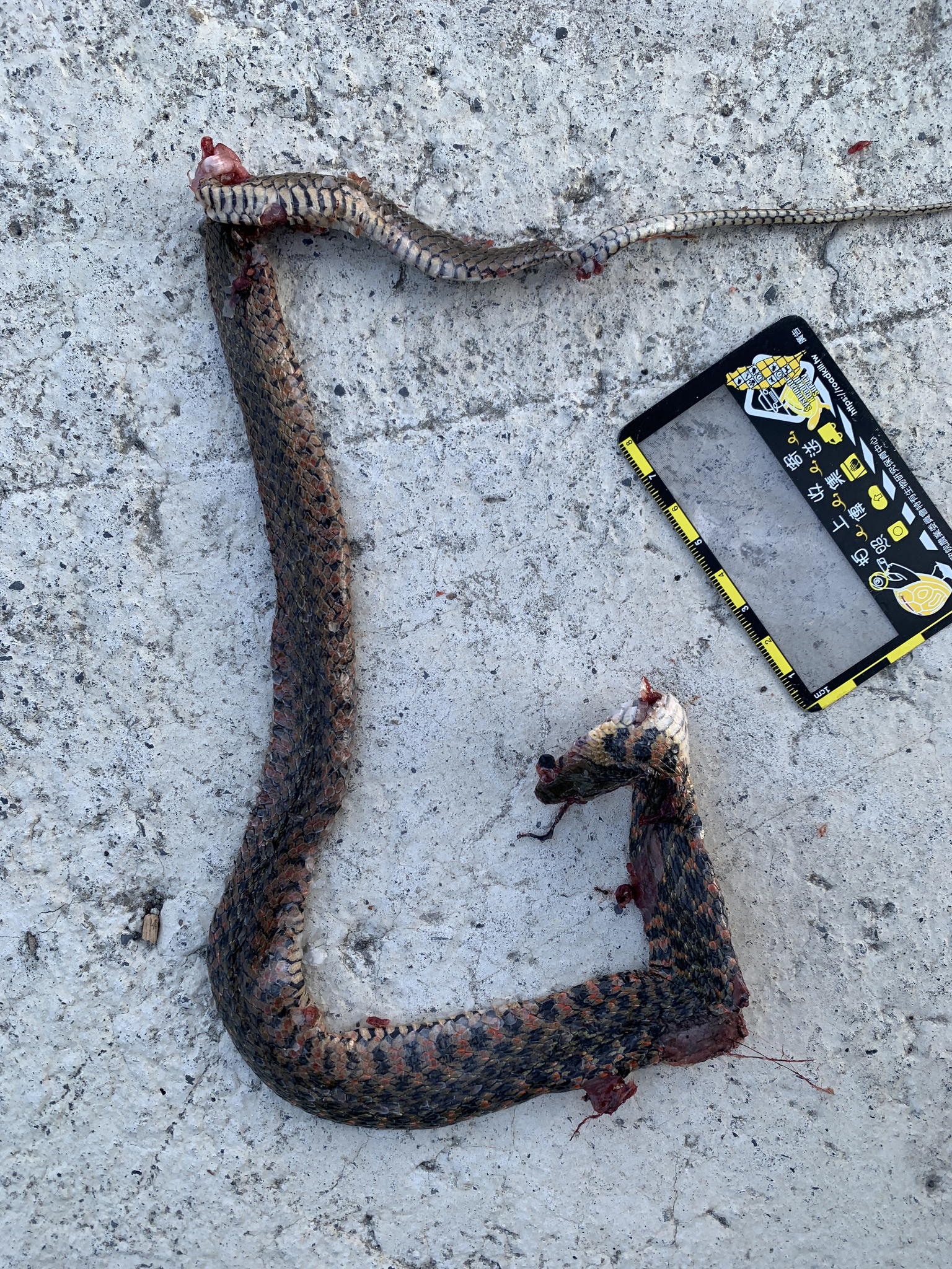 特徵說明: 紅色型草花蛇,腹部為黑色分節橫線紋,背上黃黑方格斑紋及側身紅黑方格斑紋,尾巴細長,眼旁有兩道黑斑