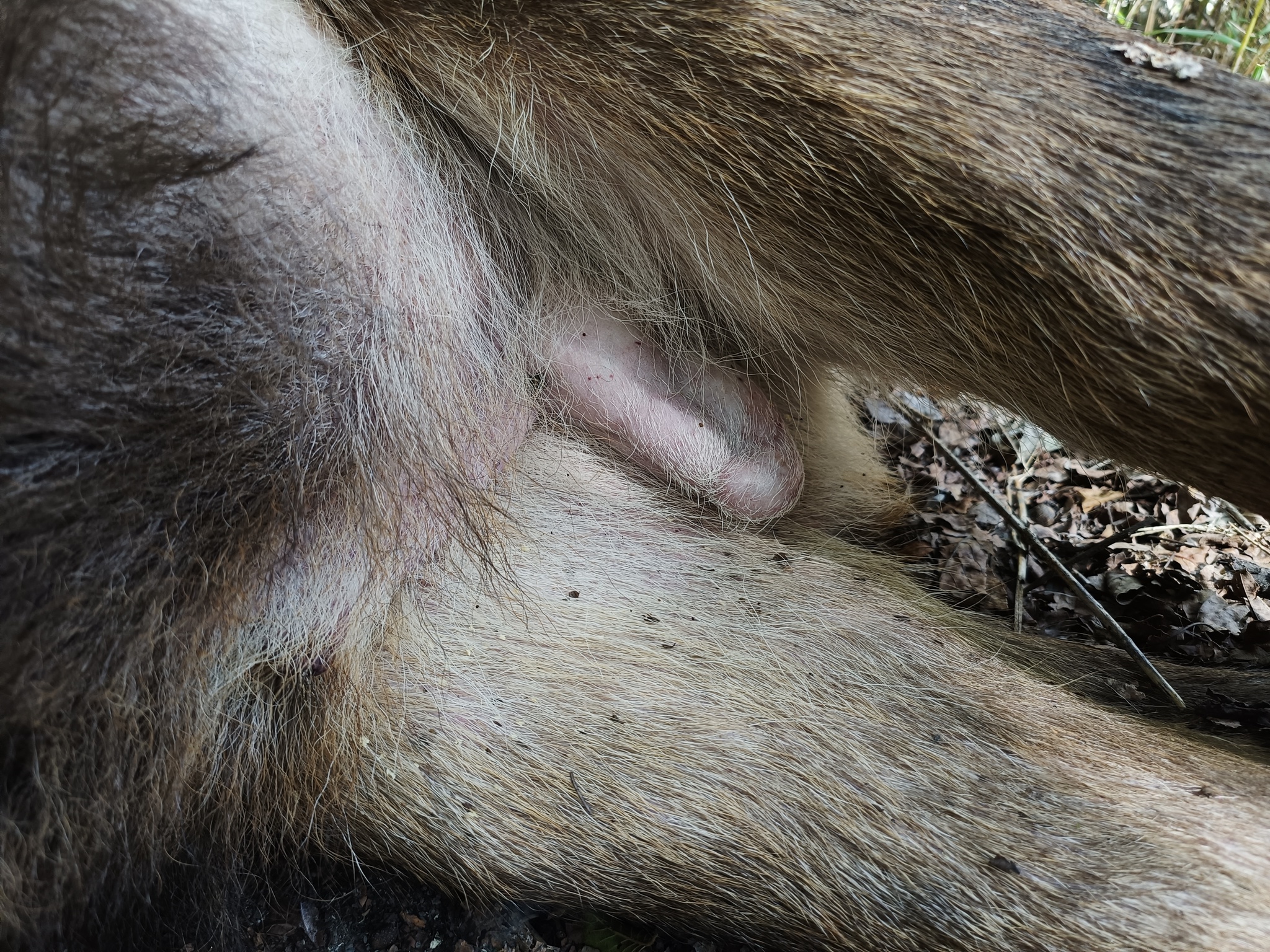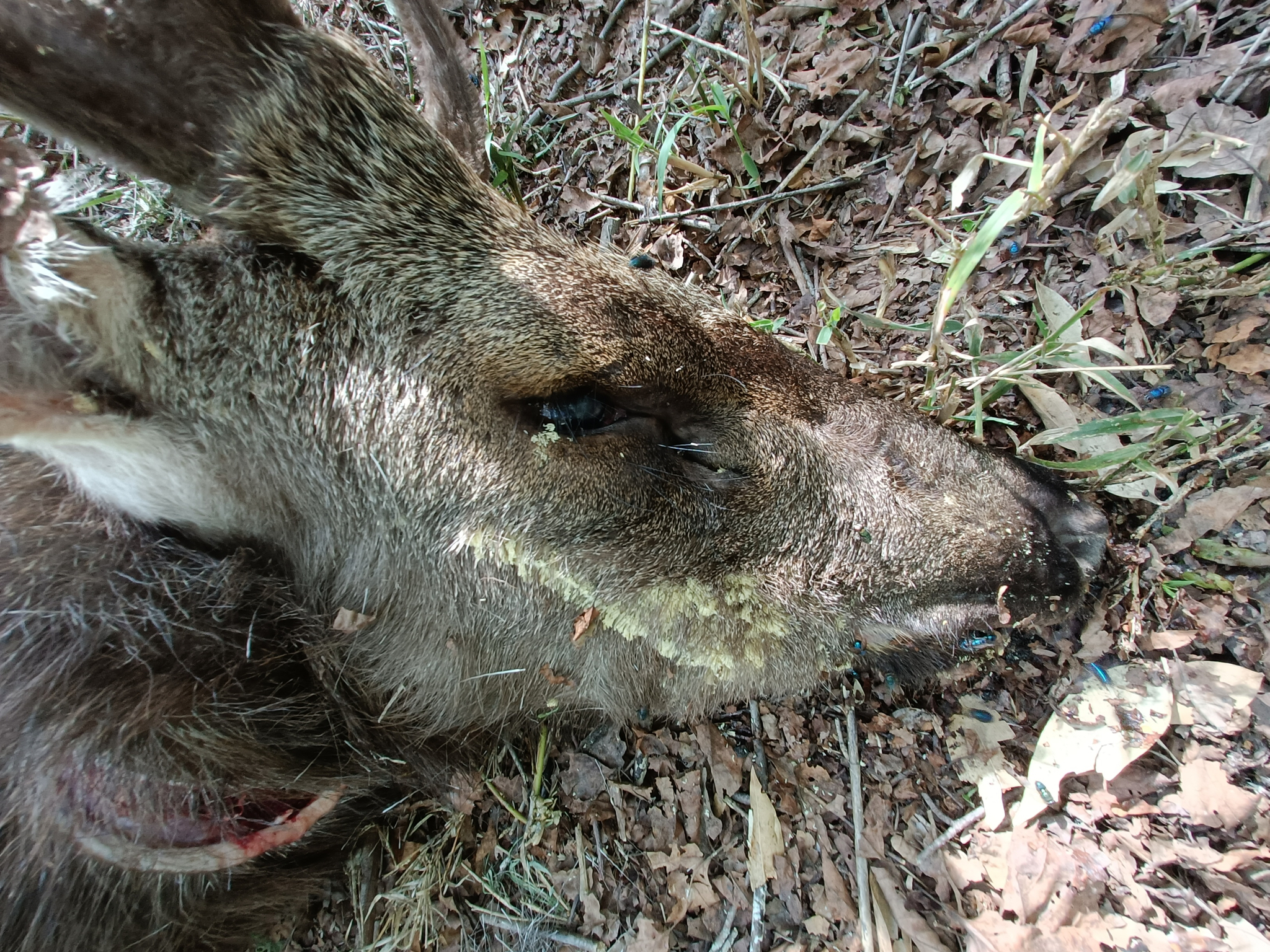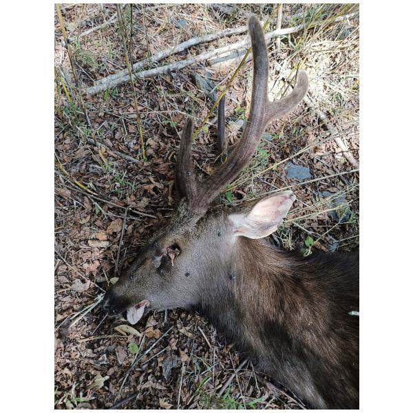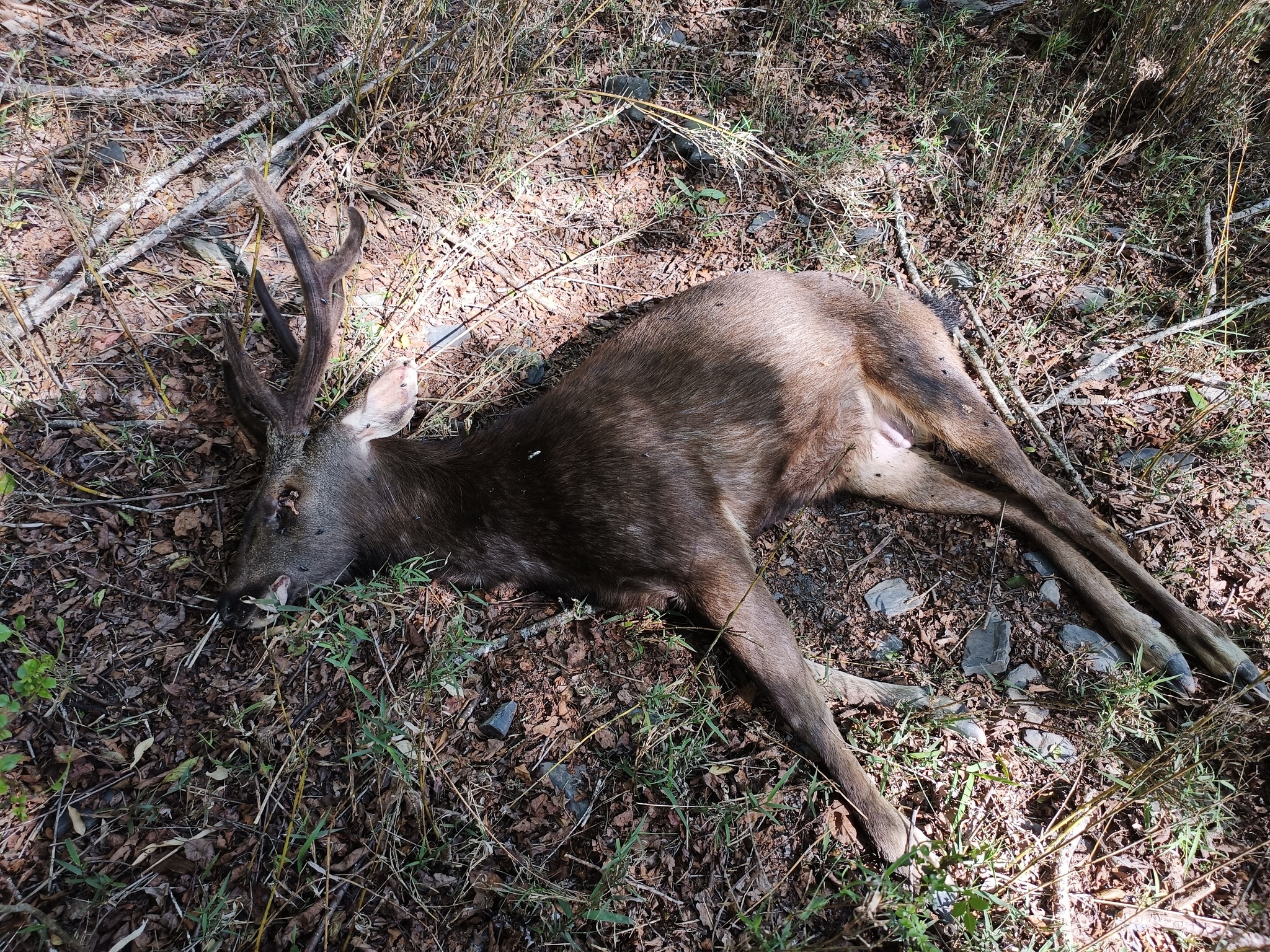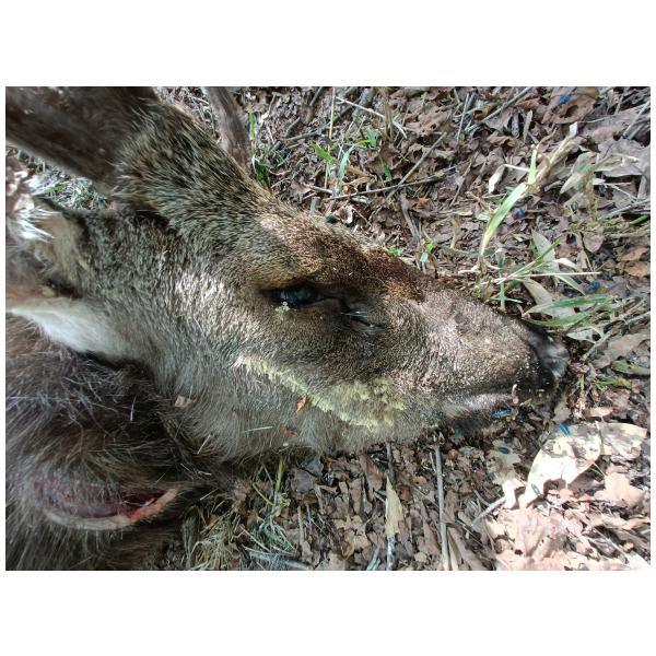 之前不知道有這個社團,所以補回報。遇到的地點是在奧萬大遊樂區進去的萬大北溪支流,當時是跟原住民朋友去看有沒有偷木頭的山老鼠,結果在溪床旁邊發現牠。因為牠身上的蒼蠅卵當時還沒孵化,沒有看到蛆,所以判斷可能死1-2天。牠身上都沒有外傷,但有超大量蜱蟲跟寄生蟲,隨便亂數大概幾千隻有,從鹿茸上面一路到全身都是,因為畫面實在太可怕,拍拍照紀錄而已,我們懷疑牠可能是被這些吸血蟲搞死。反正不知道原因,覺得這個案例可能很有趣,有這個社團就回報,感謝平台!