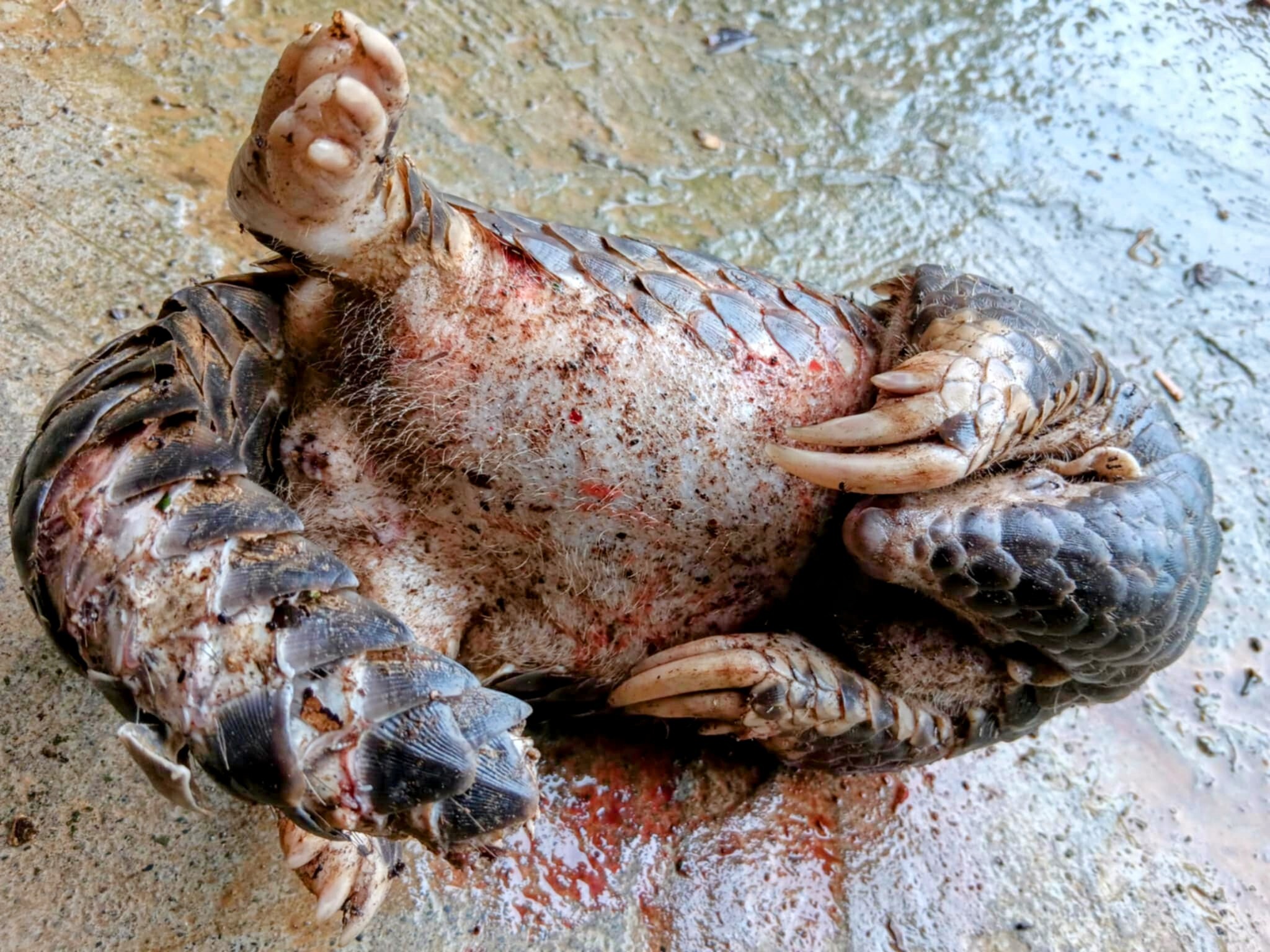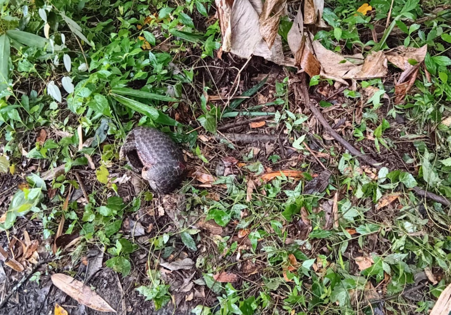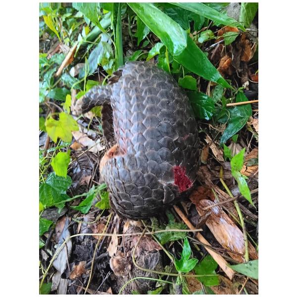 路邊坡地前 一隻捲曲著 穿山甲 周圍大約150公分寬的範圍 看出有打鬥的痕跡 身上的傷口還鮮血淋淋, 明顯是受到犬隻攻擊 死亡時間不久。