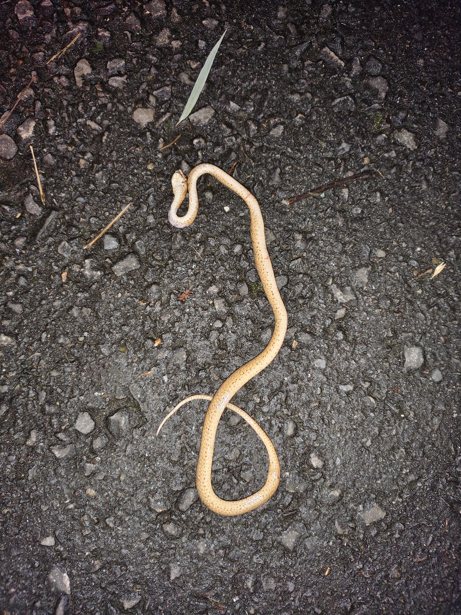 挑戰失敗 頭型偏圓,腹部散步黑色斑點,虹膜為黃色,以上皆為鈍頭蛇屬之特徵 |