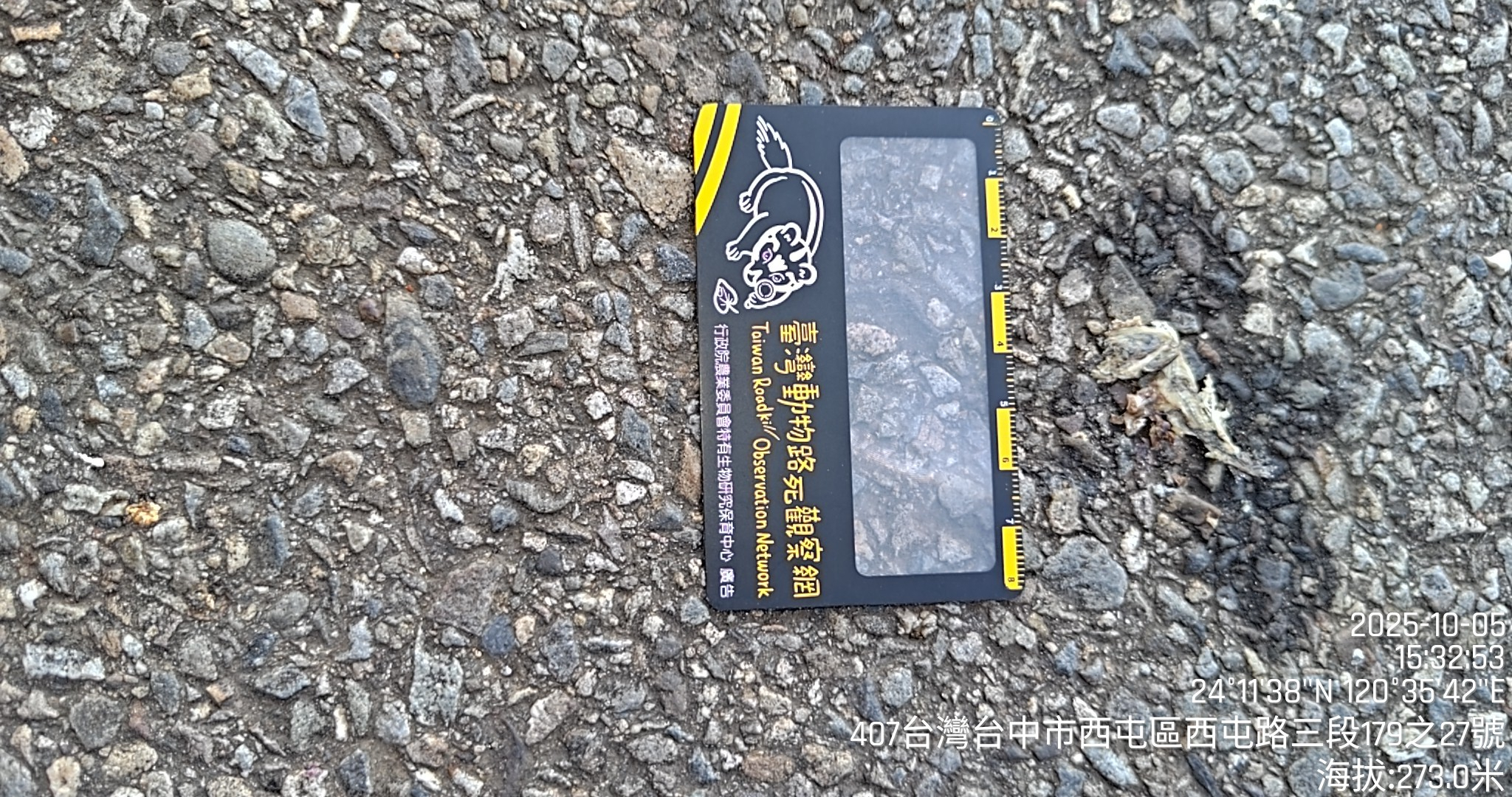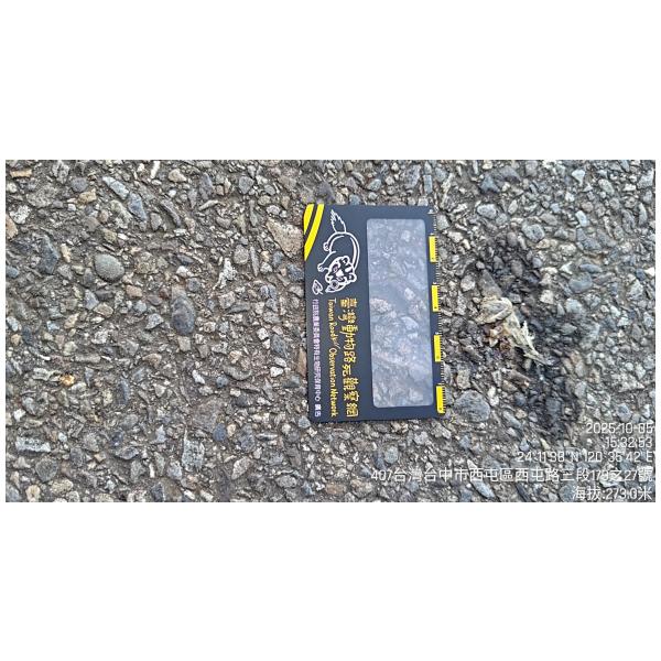 物種--- (未鑑定)[原始紀錄物種] --鑑定未鑑定敏感層級座標不開放紀錄時間2025-10-05 15:32地點記錄者超生 (Double Lin)調查活動2025秋季(十月)系統化路死動物暨遊蕩犬貓數量調查: 調查活動 533829數量1 死因 路殺 類群 爬行 標本未採集標本 補充說明 鑑定題庫授權照片授權: CC BY (Double Lin)識別號74df930a-60e9-4ae4-82d3-0b5778a4d7d7 (OccurrenceUUID)533833 (nid)