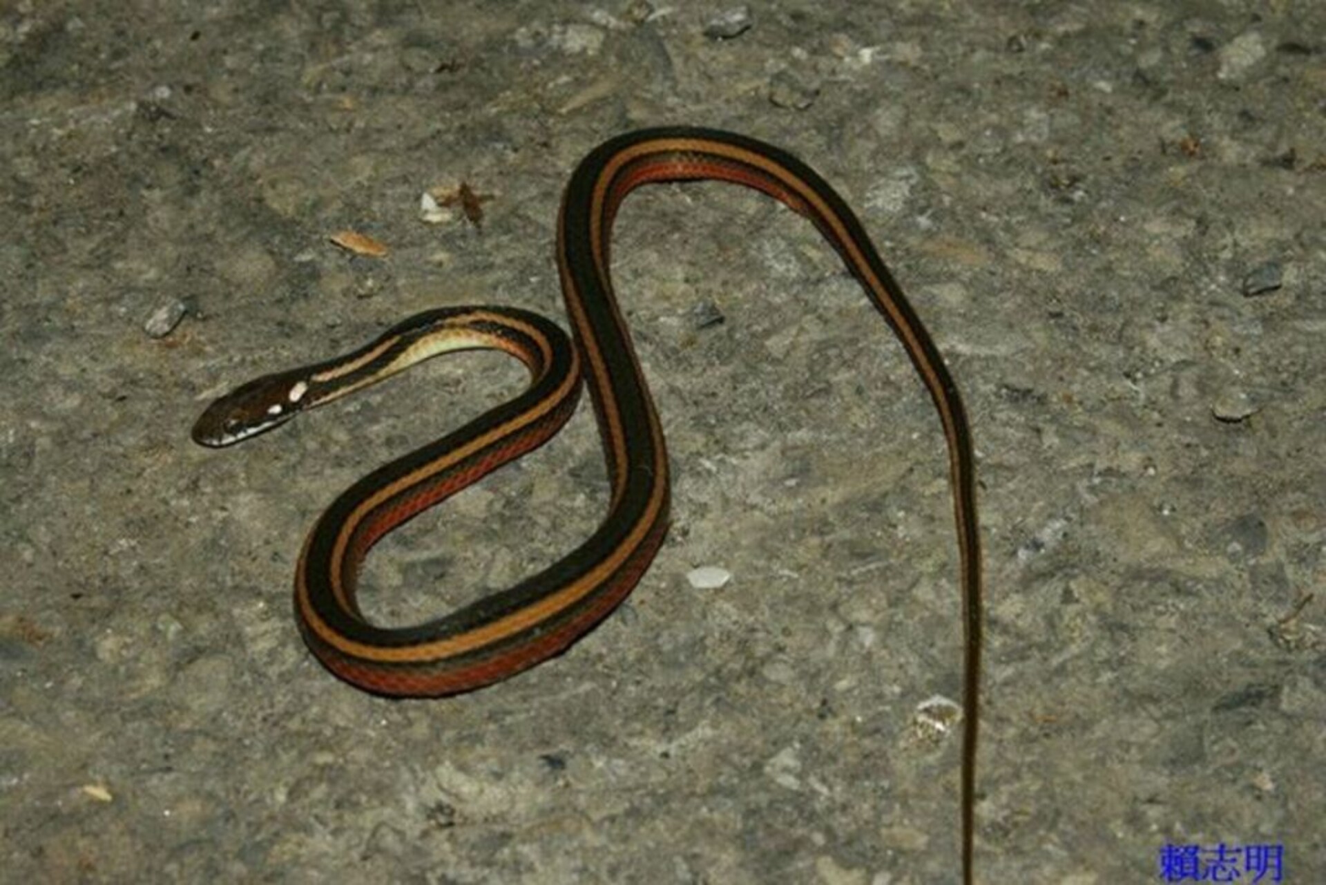 物種金絲蛇 Hebius miyajimae[原始紀錄物種] --鑑定 ● 鑑定時間未知敏感層級輕度紀錄時間2008-08-25 00:00地點 桃園市復興區 桃園縣復興鄉北部橫貫公路記錄者賴志明數量1 死因 路殺 類群 標本未採集標本 補充說明 鑑定題庫爬蟲類: 學習級 I、學習級 II、考試級 I 特徵說明: 頭及體背顏色以灰黑色為底,體背有四條橘黃(或橘紅)色的縱帶,上下唇鱗為白色的,唇邊帶有黑色線。 授權照片授權: CC BY (賴志明)識別號7f13d3e5-c7f5-40de-8844-bbe97db25fa7 (OccurrenceUUID)5385 (nid)