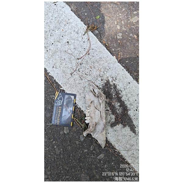 物種--- (未鑑定)[原始紀錄物種] --鑑定未鑑定敏感層級座標不開放紀錄時間2026-03-17 12:42地點記錄者Double Lin調查活動調查活動 553807數量1 死因 其它死因 類群 哺乳 標本未採集標本 補充說明 鑑定題庫授權照片授權: CC BY (Double Lin)識別號5848c7f0-5705-4089-b7f8-668f2e91385f (OccurrenceUUID)553808 (nid)