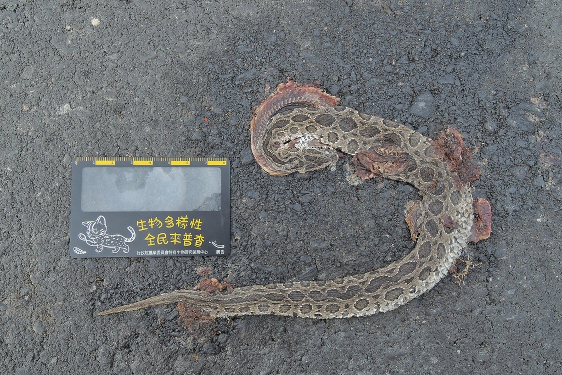 特徵說明: 頭部略呈三角形,頭和身體有許多橢圓形斑紋,體背中央的橢圓形斑紋常前後相連;腹部白底但是有許多黑色斑點