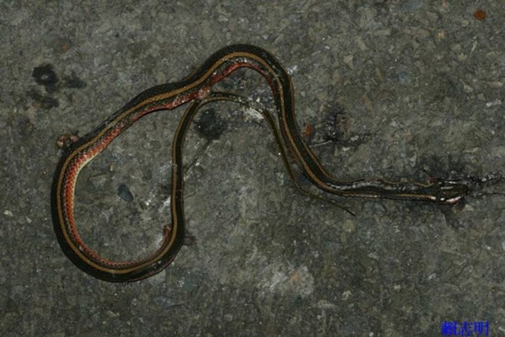 物種金絲蛇 Hebius miyajimae[原始紀錄物種] --鑑定 ● 1999-11-30敏感層級輕度紀錄時間2008-08-10 00:00地點 桃園市復興區 北部橫貫公路記錄者賴志明數量1 死因 路殺 類群 標本未採集標本 補充說明 鑑定題庫爬蟲類: 學習級 I 特徵說明: 小型蛇類,體背黑褐色,體側具橘紅色縱帶從頸部延伸到尾部。頭部特徵:頸部左右各有一白斑且上唇鱗片白色,腹部為淡黃色。 授權照片授權: CC BY (賴志明)識別號5b661224-65c5-427d-9c18-62c6c4e3bc07 (OccurrenceUUID)5936 (nid)