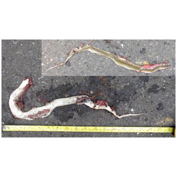 特徵說明: 背部底色為灰褐色,頭頂後緣有一W字型的深色斑,背部有兩條褐色縱帶,腹鱗黑斑較不規則出現。