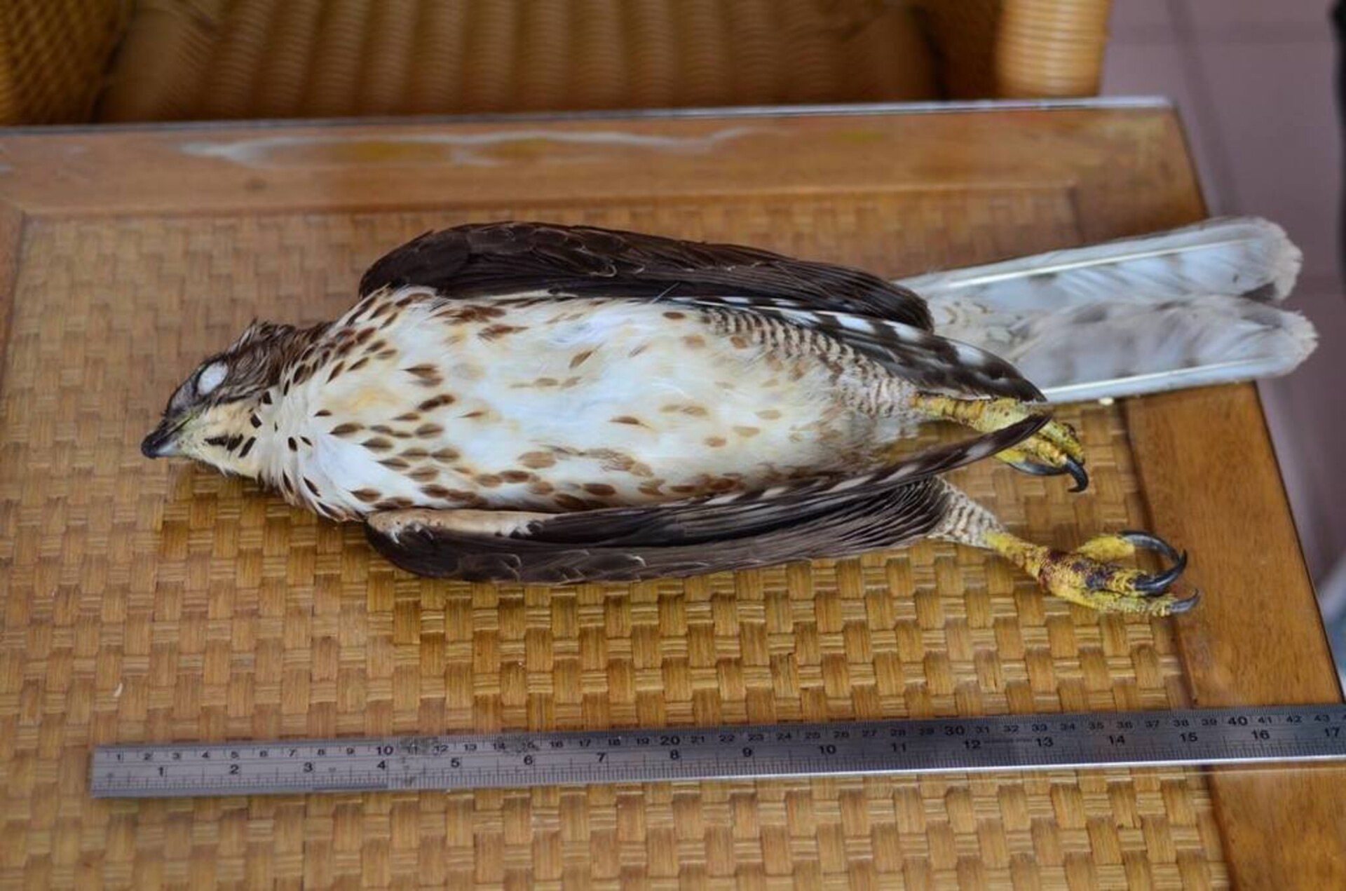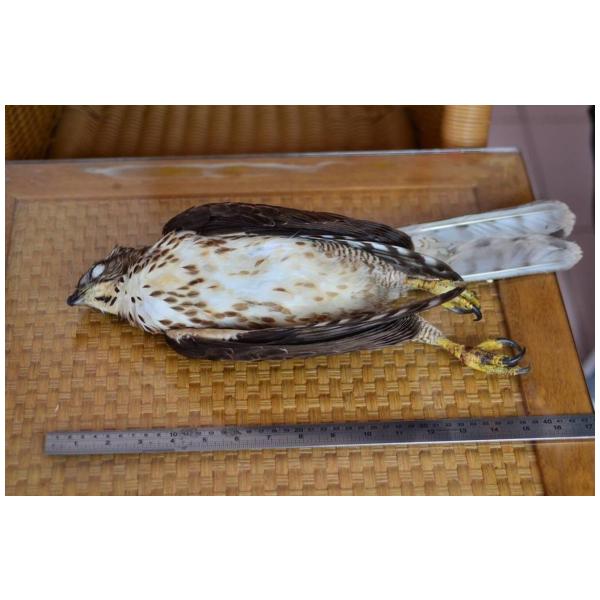 背後深褐色,腹面白色,喉白,有一道明顯褐色喉央線,胸部佈有赤褐色縱紋,腹部密布褐色橫紋,尾下覆羽白而蓬鬆。