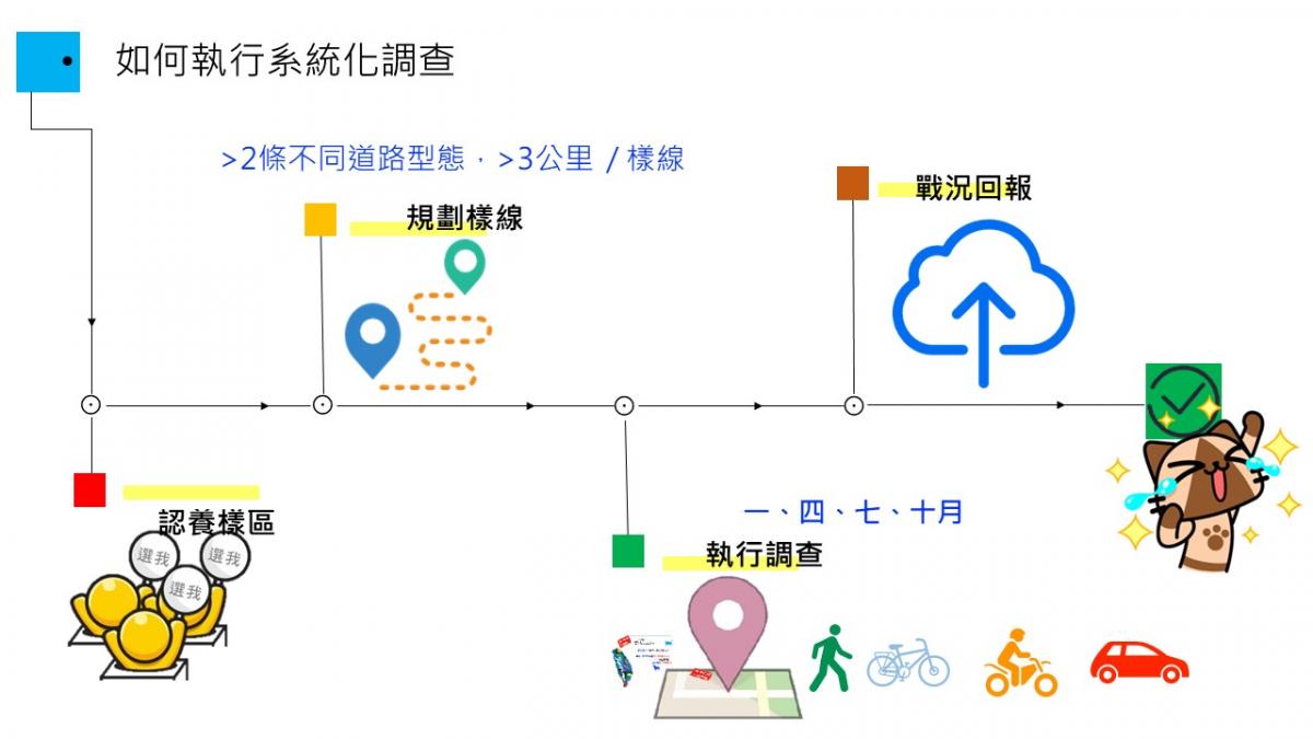 為顧及參與者的可付出時間和到達樣區方格的便利性,同時兼顧資料品質和控制影響調查成果的變因,系統化調查不限制參與者使用之交通方式,步行、騎自行車、機車或駕駛汽車皆可(以前3種最佳),不同樣線可用不同交通方式,記錄巡視認養路段單趟「1次」(請勿來回巡視多次,雙線道以上的道路也僅只需記錄一側即可),將見到的所有路死脊椎動物(含寵物種類、貓狗、外來種等)及陸蟹拍照記錄,並同時記錄當日調查期間沿途所見到的遊蕩犬貓數量(犬貓數量分別記錄於不同欄位)。駕駛汽車調查時,請盡量保持平均時速20公里/小時以下,避免車速過快而遺漏紀錄路死小動物。每次調查時必需在記錄表格中登載當次調查所使用之交通工具。