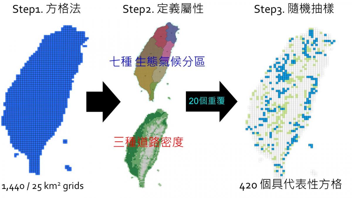 為方便系統化選取具代表性樣區,我們以方格法先將台灣切分成約1,440個5*5公里的方格,扣除沒有道路的方格後,再以影響路殺的主要因子:道路密度(分3個等級)、道路型態(上述兩項因子會影響交通流量)及生態氣候分區(影響動物的分布及族群量,本島共分7個生態氣候分區)做為路殺調查樣區選取依據,由於生態氣候分區的面積不同,因此依生態氣候分區面積比例,以分層逢機取樣的方式隨機選取具有代表性的樣區方格(7種生態氣候分區*3種道路密度*20重覆取樣=420個樣區方格),開放供有意參與者挑選。認養方格樣區的公民科學家在每年的四及十月,於該月之中任選一天至樣區方格中進行一次詳細的動物路死調查(調查路線選擇方式請見下方說明),再透過系統化調查的專屬上傳系統,每季調查完成後回傳資料,藉此獲得完整且可統計分析的路殺公民科學資料。每個隊伍可以認養1個以上的方格樣區,依小隊的時間及能力而定,量力而為。